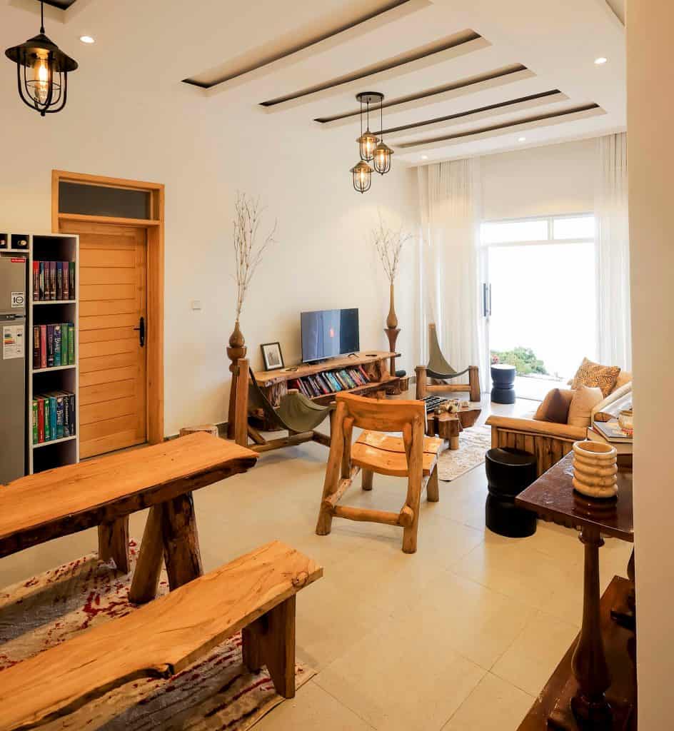 A warm and inviting space surrounded by nature, ideal for a peaceful and comfortable retreat experience.